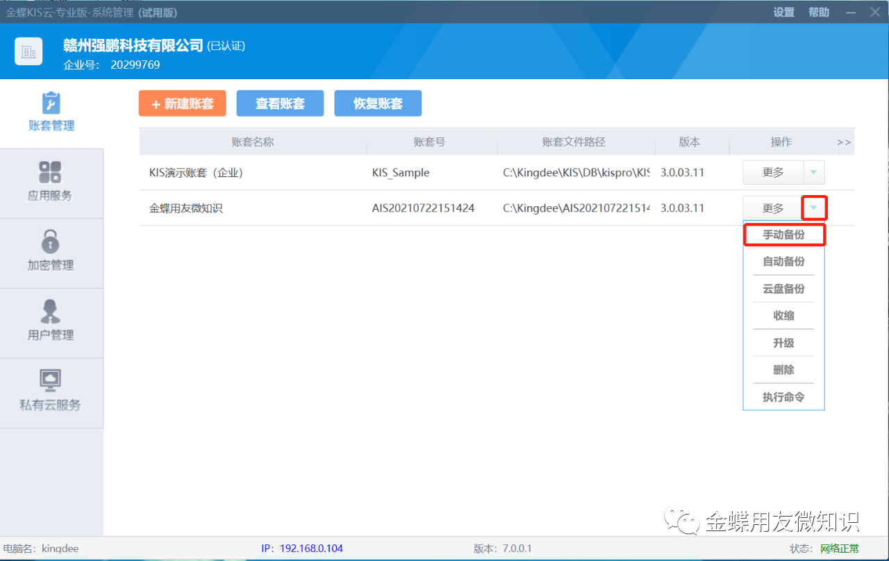 首先,進(jìn)入金蝶KIS云專業(yè)版系統(tǒng)管理,在賬套管理里選擇到需要備份的賬套來(lái),然后點(diǎn)“更多”右邊的下三角,出現(xiàn)手動(dòng)重備份