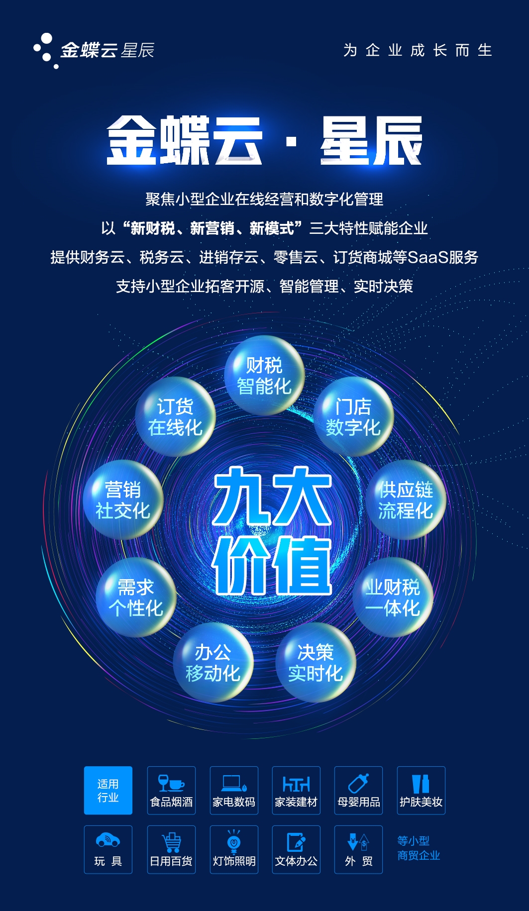 金蝶云?星辰,是基于金蝶云·蒼穹PaaS平臺而生,構(gòu)建小微企業(yè)智慧成長的一站式服務(wù)平臺。其聚焦小微企業(yè)在線經(jīng)營和數(shù)字化管理,以“新財(cái)稅、新營銷、新平臺”三大特性賦能企業(yè),提供財(cái)務(wù)云、稅務(wù)云、進(jìn)銷存云、訂貨商城等SaaS服務(wù),九大價值賦能企業(yè),支持企業(yè)拓客開源、智能管理和實(shí)時決策。