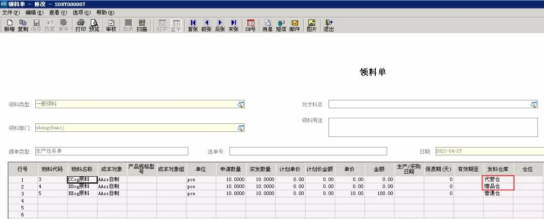 與入庫業(yè)務(wù)一樣,用戶也能根據(jù)單據(jù)分錄的倉庫屬性,將廢品、贈品、客供料類物料直接與正常物料一起執(zhí)行出庫流程,并在同一單據(jù)上高效處理虛實倉的出入庫業(yè)務(wù)。