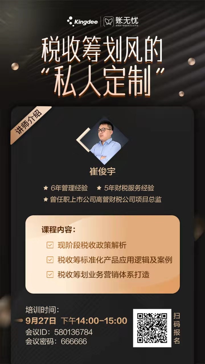 會議主題:稅籌業(yè)務培訓會議時間:2021/09/27 14:00-15:00 (GMT+08:00) 中國標準時間 - 北京