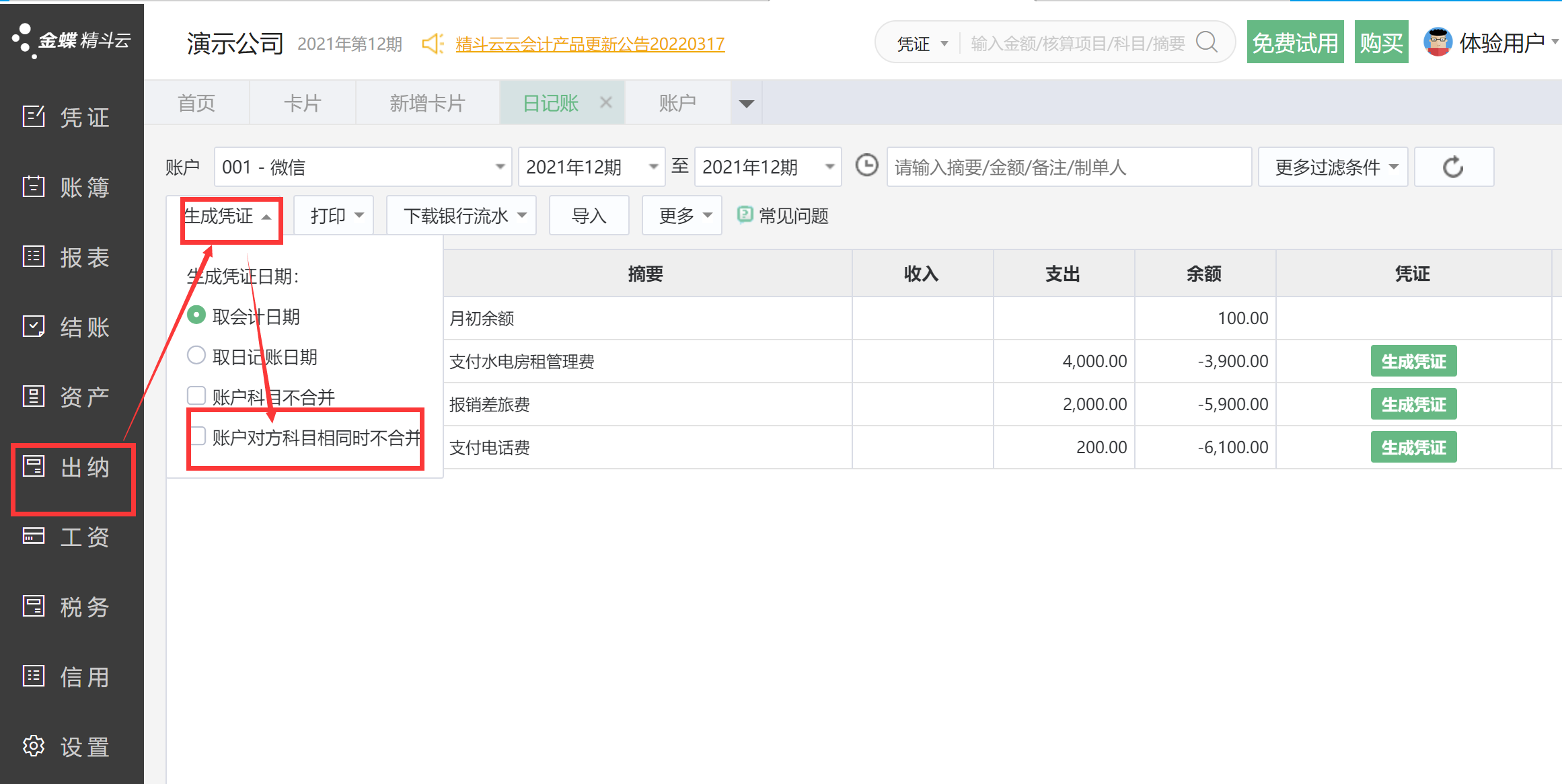 2、日記賬會(huì)計(jì)科目相同時(shí),系統(tǒng)可以合并生成憑證;