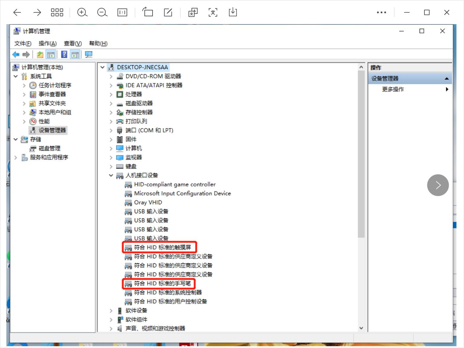 點(diǎn)擊win10系統(tǒng)桌面 “此電腦”——鼠標(biāo)右鍵 “管理”——“設(shè)備管理器”——“人機(jī)接口設(shè)備”: “符合 HID 標(biāo)準(zhǔn)的觸摸板”和 “符合 HID標(biāo)準(zhǔn)的手寫筆” 禁用,重啟電腦。