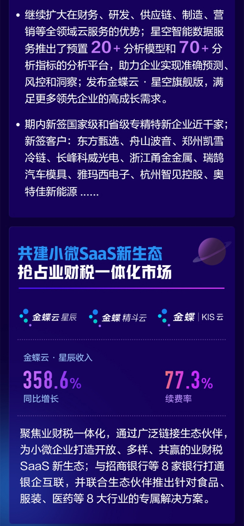 報(bào)告期內(nèi),小微財(cái)務(wù)云服務(wù)繼續(xù)保持快速增長,收入同比增長約63.1%,其中金蝶云·星辰收入同比增長約358.6%,續(xù)費(fèi)率77.3%。期內(nèi),金蝶云·星辰聚焦業(yè)財(cái)稅一體化,通過廣泛連接生態(tài)伙伴,為小微企業(yè)打造開放、多樣、共贏的業(yè)財(cái)稅SaaS新生態(tài),讓小微企業(yè)在抗風(fēng)險(xiǎn)能力、管理機(jī)制建設(shè)、資源分配等各方面得以升華;與招商銀行等8家銀行攜手打通銀企互聯(lián),并聯(lián)合生態(tài)伙伴推出針對食品、服裝、醫(yī)藥等8大行業(yè)的專屬解決方案。