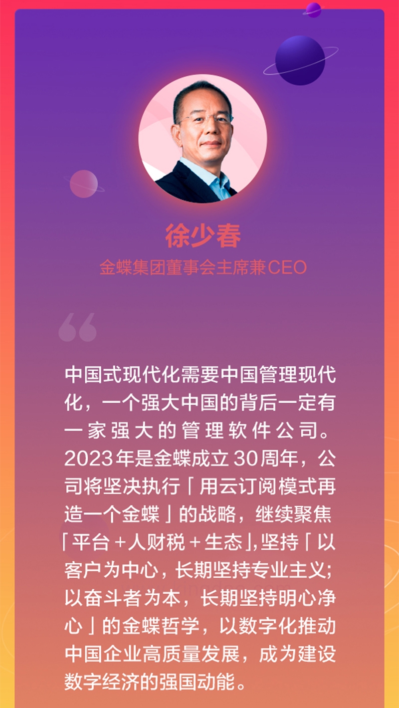 金蝶集團(tuán)董事會主席兼CEO徐少春表示,中國式現(xiàn)代化需要中國管理現(xiàn)代化,一個(gè)強(qiáng)大中國的背后一定有一家強(qiáng)大的管理軟件公司。過去30年間,金蝶逐步成長為全球領(lǐng)先、中國第一的企業(yè)管理云SaaS公司,助力中國企業(yè)加速邁向世界一流。2023年是金蝶三十歲再出發(fā)的一年,公司將堅(jiān)決執(zhí)行「用云訂閱模式再造一個(gè)金蝶」的戰(zhàn)略,繼續(xù)聚焦「平臺+人財(cái)稅+生態(tài)」,堅(jiān)持「以客戶為中心,長期堅(jiān)持專業(yè)主義;以奮斗者為本,長期堅(jiān)持明心凈心」的金蝶哲學(xué),堅(jiān)持更好的產(chǎn)品、更好的生態(tài)、更好的交付、更好的服務(wù)、更好的口碑,以數(shù)字化推動(dòng)中國企業(yè)高質(zhì)量發(fā)展,成為建設(shè)數(shù)字經(jīng)濟(jì)的強(qiáng)國動(dòng)能。