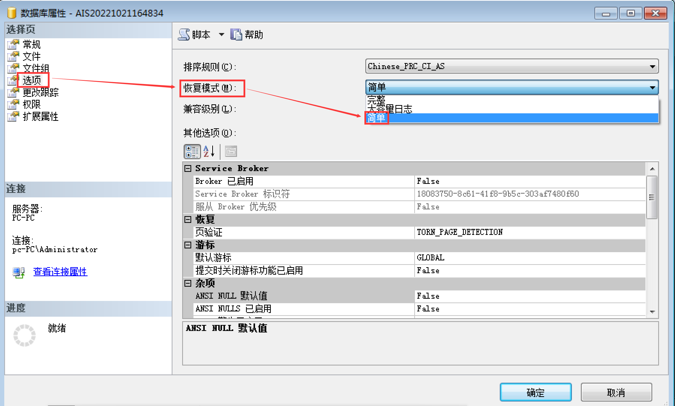 登錄SQL數(shù)據(jù)庫——選中 問題賬套——鼠標(biāo)右鍵【屬性】——彈出【數(shù)據(jù)庫屬性 框】——選項(xiàng)——恢復(fù)模式——簡單。