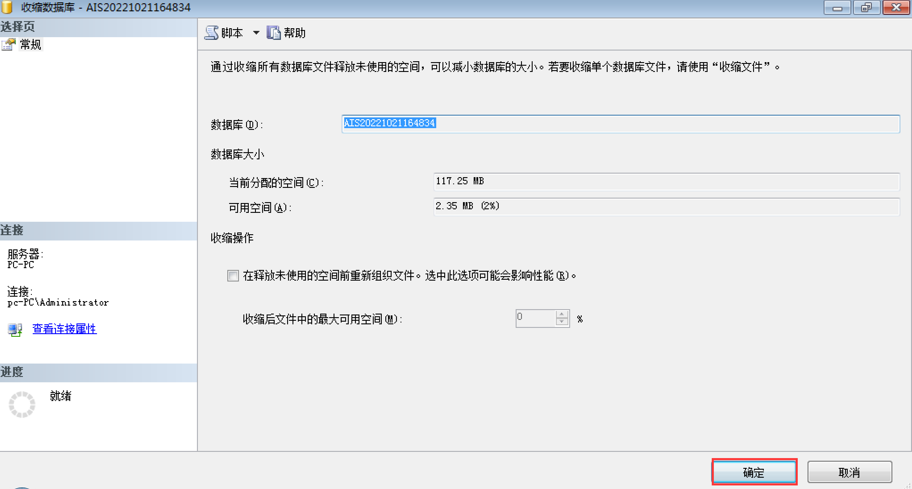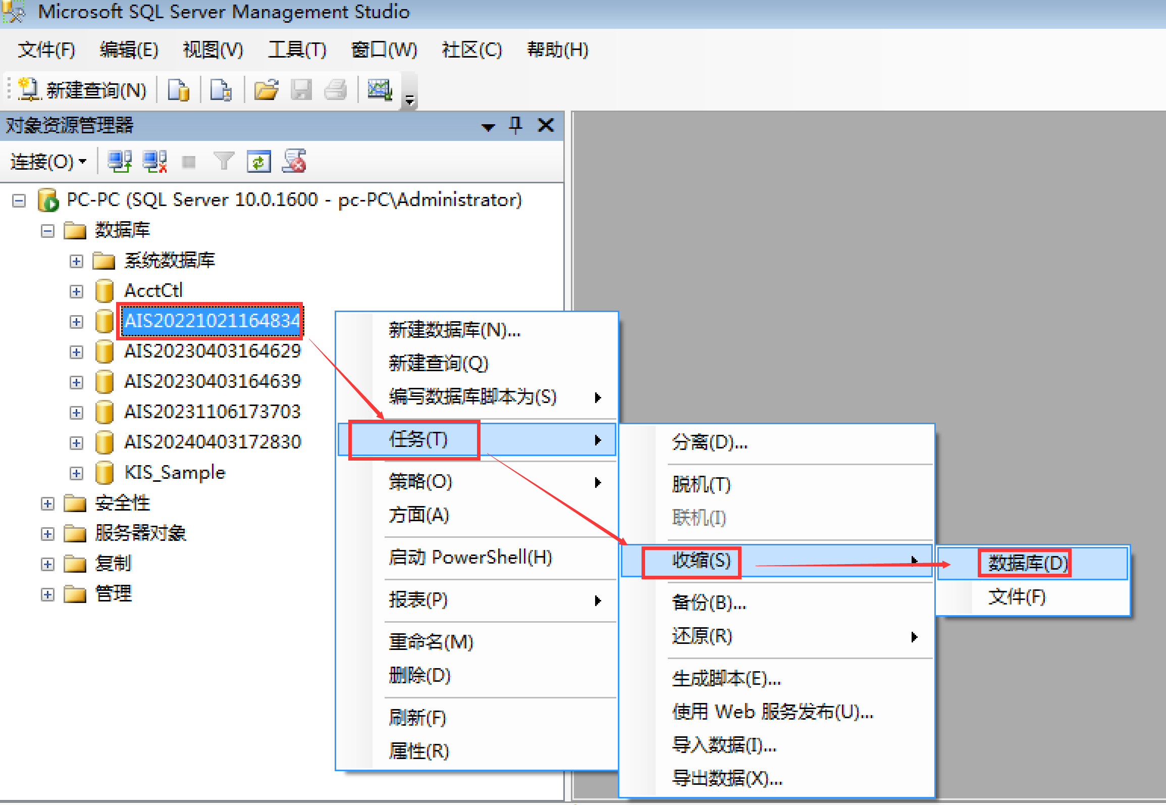 選中 問題賬套——鼠標(biāo)右鍵【任務(wù)】——【收縮】——【數(shù)據(jù)庫】——確定。