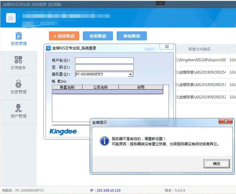 金蝶KIS專(zhuān)業(yè)版 客戶(hù)端分機(jī)登錄,經(jīng)常出現(xiàn) 金蝶KIS連接, 提示"服務(wù)器不是有效的,請(qǐng)重新設(shè)置,可能原因:服務(wù)器端沒(méi)有建立賬套、加密服務(wù)器沒(méi)有啟用或其它" 錯(cuò)誤提示 造成登錄金蝶軟件賬套為空。