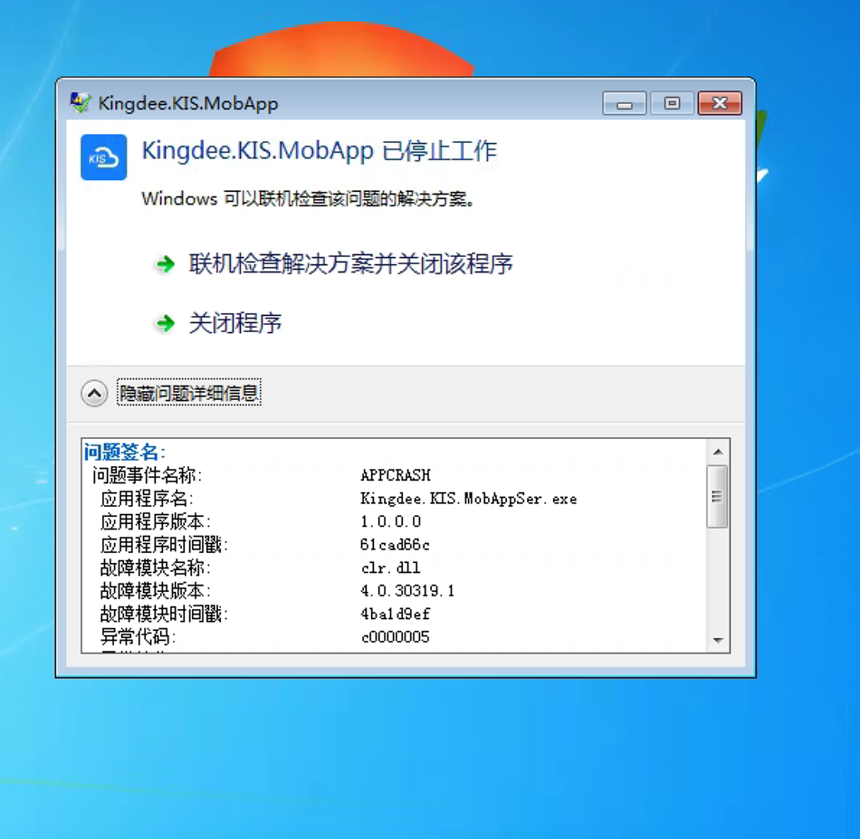 金蝶系統(tǒng)管理工具登錄提示 kingdee.KIS.MobApp已停止工作