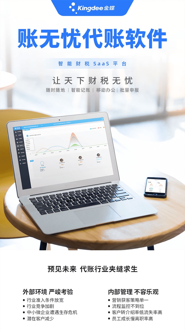 金蝶賬無憂是為財(cái)稅代賬公司量身定制的互聯(lián)網(wǎng)智能財(cái)稅SaaS平臺,由金蝶國際軟件集團(tuán)傾力打造,依托金蝶28年的企業(yè)管理和精斗云14年的財(cái)務(wù)云服務(wù)經(jīng)驗(yàn)的累積,融合移動互聯(lián)網(wǎng)、大數(shù)據(jù)、AI智能、云計(jì)算新一代信息技術(shù),以“一鍵無憂”為理念,助力代賬公司轉(zhuǎn)型升級,實(shí)現(xiàn)輕松代賬。