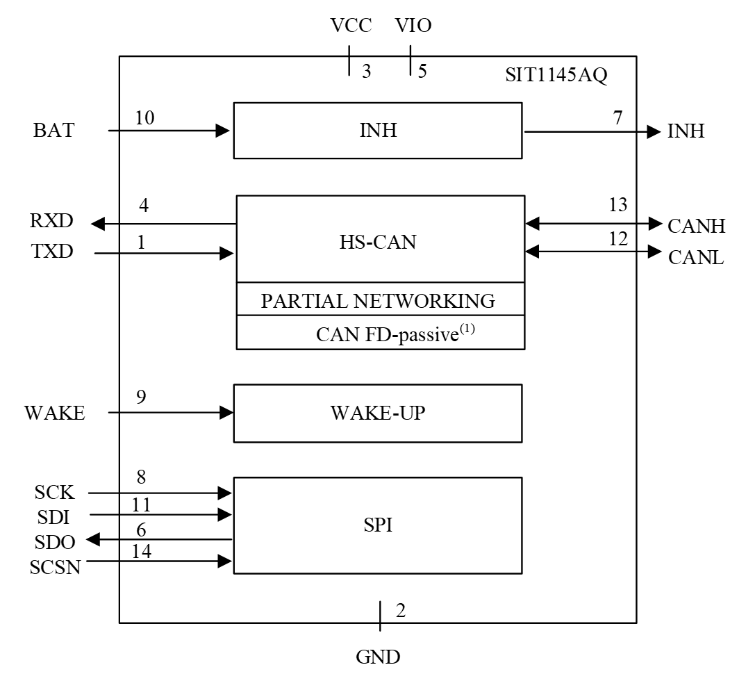 SIT1145AQ擁有五種工作模式:正常工作模式、靜音模式、待機(jī)模式、睡眠等待模式和睡眠模式。除了有本地喚醒、遠(yuǎn)程喚醒(任意幀喚醒)外,還可以通過SPI設(shè)置SIT1145AQ為選擇性喚醒。通過設(shè)置芯片內(nèi)的寄存器來設(shè)置喚醒幀的范圍,進(jìn)入睡眠模式后,需要總線上有匹配波特率并符合設(shè)置的喚醒幀范圍的報(bào)文才會(huì)喚醒SIT1145AQ,有效減少了主控芯片的喚醒次數(shù)和資源占用,極大節(jié)省 CAN 總線應(yīng)用系統(tǒng)的電力和節(jié)點(diǎn)功耗。SIT1145AQ帶INH腳功能,能夠控制給系統(tǒng)供電的LDO,使系統(tǒng)在休眠模式下關(guān)閉LDO輸出,實(shí)現(xiàn)整板休眠達(dá)到最低功耗,以滿足客戶的更低功耗需求。