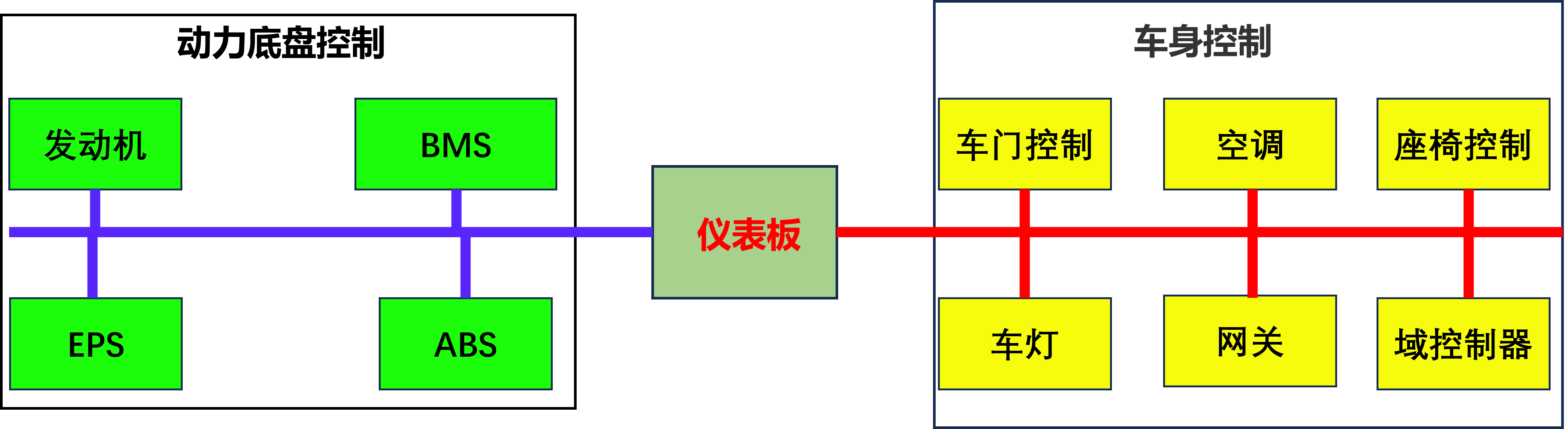 隨著汽車ECU越來(lái)越多,如ABS,電控門(mén)窗,電子燃油噴射裝置。如果仍然采用常規(guī)的點(diǎn)對(duì)點(diǎn)布線方式,如圖1所示,將會(huì)導(dǎo)致車上信號(hào)傳輸線數(shù)目的急劇增加,從而帶來(lái)線束的冗余及維修成本的提高。這就對(duì)汽車的線束分布及信息通訊提出了更高的要求。總線技術(shù)可以實(shí)現(xiàn)信息的實(shí)時(shí)共享,解決了傳統(tǒng)布線方式中線束多,布線難,成本高等問(wèn)題,CAN(Controller Area Network)總線技術(shù)應(yīng)運(yùn)而生,如圖2所示。